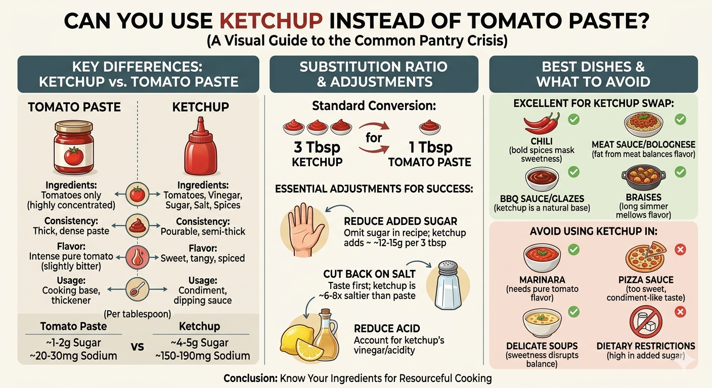 Używanie ketchupu zamiast koncentratu pomidorowego jest uzasadnionym obejściem kuchni — nie jest to idealny zamiennik, ale praktyczny, który może zaoszczędzić posiłek, gdy zabraknie Ci opcji. Kluczem jest zrozumienie różnic: ketchup jest słodszy, cieńszy, bardziej słony i bardziej kwaśny. Zastosuj proporcję 3:1, zredukuj inne cukry i sól, ugotuj wcześniej i wybierz odpowiednie dania.